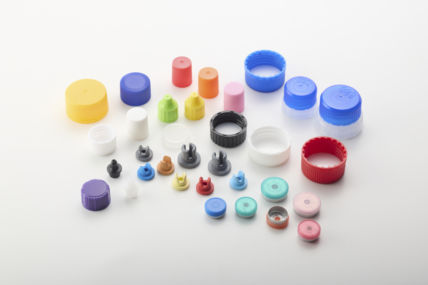◉ 主な製品 ・ゴム栓:PP樹脂/アルミ(φ13、φ16、φ20、φ32) 他 ・中栓:ノズル付き、ツバ付き、カラー 他 ・キャップ:PP素材、HDPE素材、アルミ素材、樹脂製 他